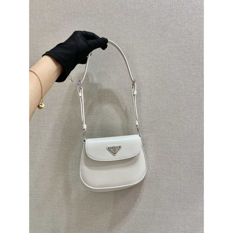 DetailThe special beveled structure of the bottom and sides of this flap bag emphasizes the smooth curved lines and gives it a sophisticated appeal, while the extended handles make it even more functional, allowing it to be worn as a shoulder bag or a tote. Brushed leather, unique to the Prada collection, is a modern, color-changing material perfect for new combinations and contrasts. A triangular enameled logo completes the silhouette.