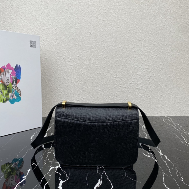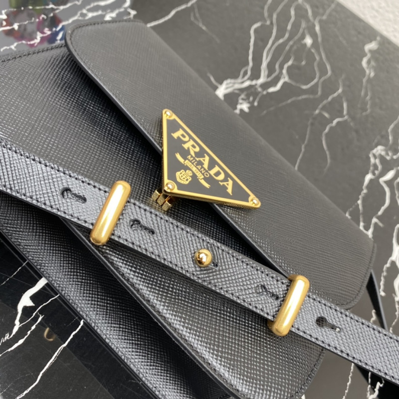 DetailStructured and classically designed in Saffiano leather, this shoulder bag is the brand's signature material, distinguished by its cross-scratch texture and waxed finish. The front is adorned with a triangular logo. Fitted with an innovatively designed handle and an adjustable shoulder strap, this piece is suitable for all occasions.