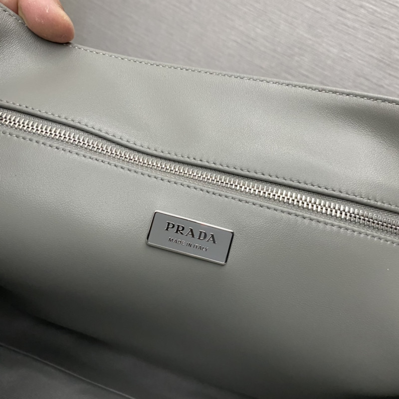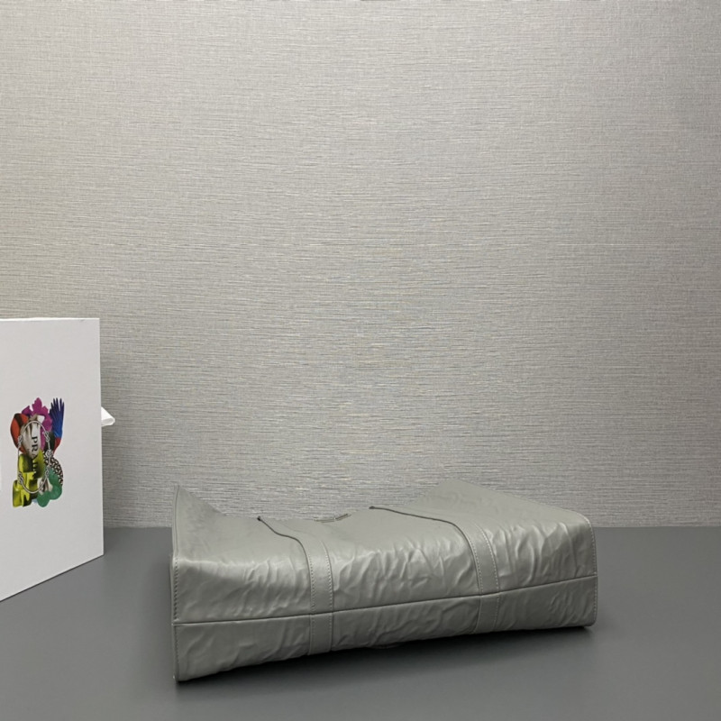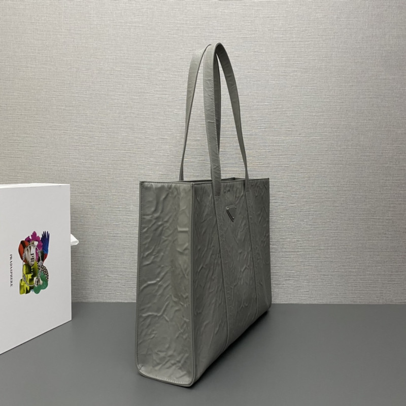 DetailCrafted from natural glossy nappa leather, this tote bag has a casual, everyday appeal. The hand-crafted pleated effect contrasts with the concept of a rigid structure, reinterpreting an everyday item that can be worn casually. Finished with a triangular enameled logo.