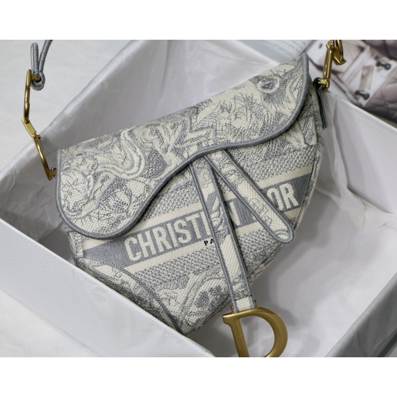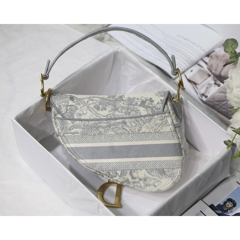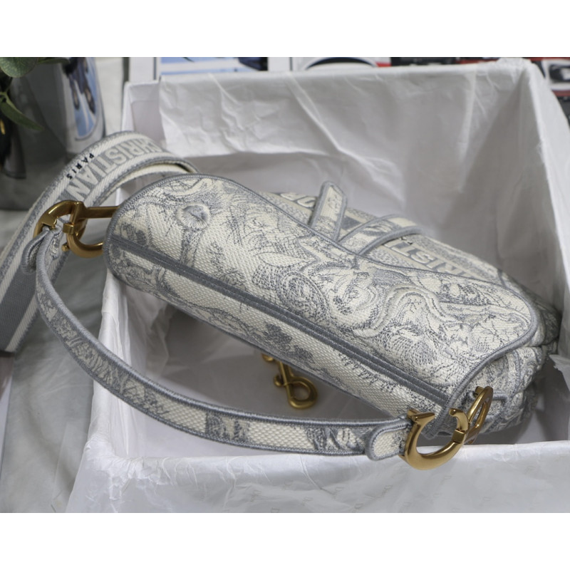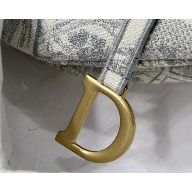 DetailEmbroidered with the Toile de Jouy motif, it reveals a saddle flap with a magnetic D-shaped stirrup clasp, as well as a CD signature in antique gold-finish metal on either side of the shoulder strap. This saddle bag has an adjustable and detachable spaghetti strap and can be carried by hand, over the shoulder or across the body.