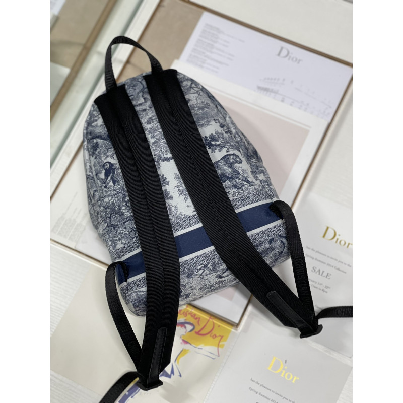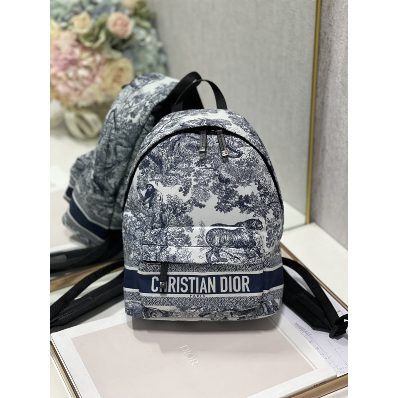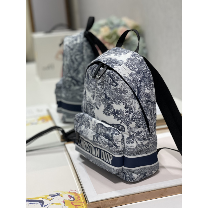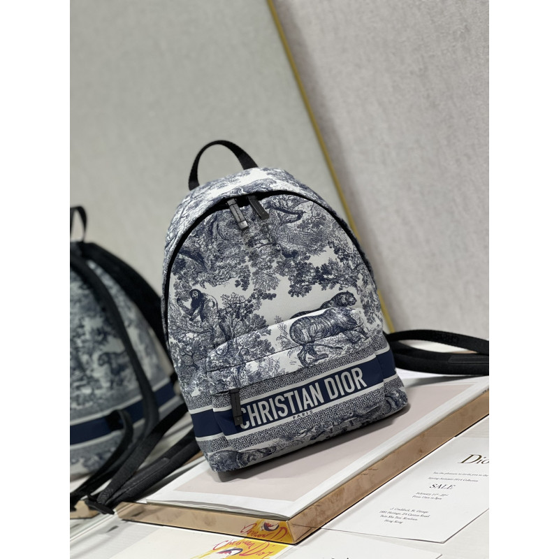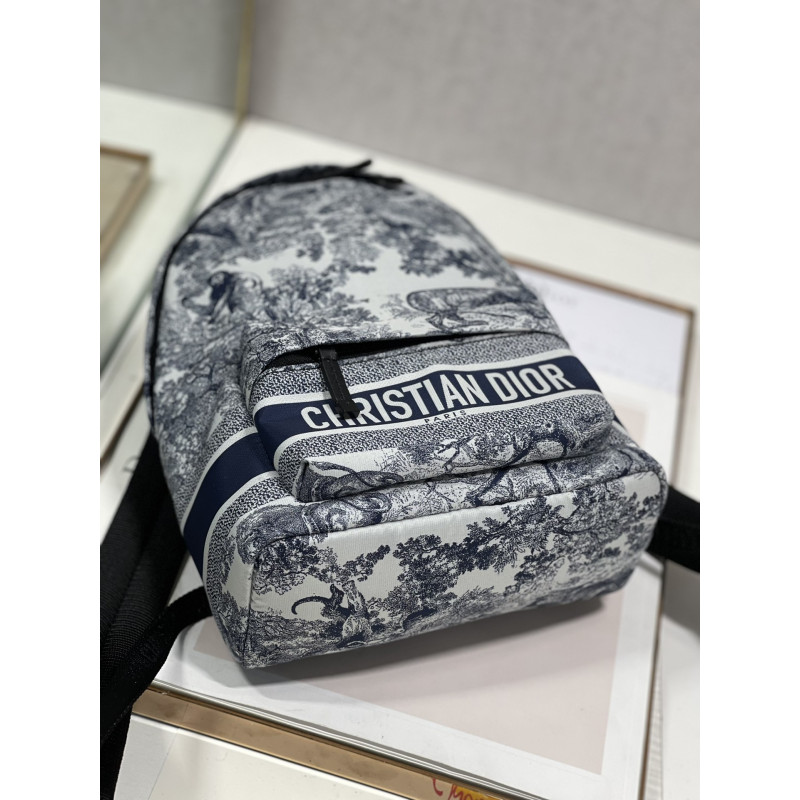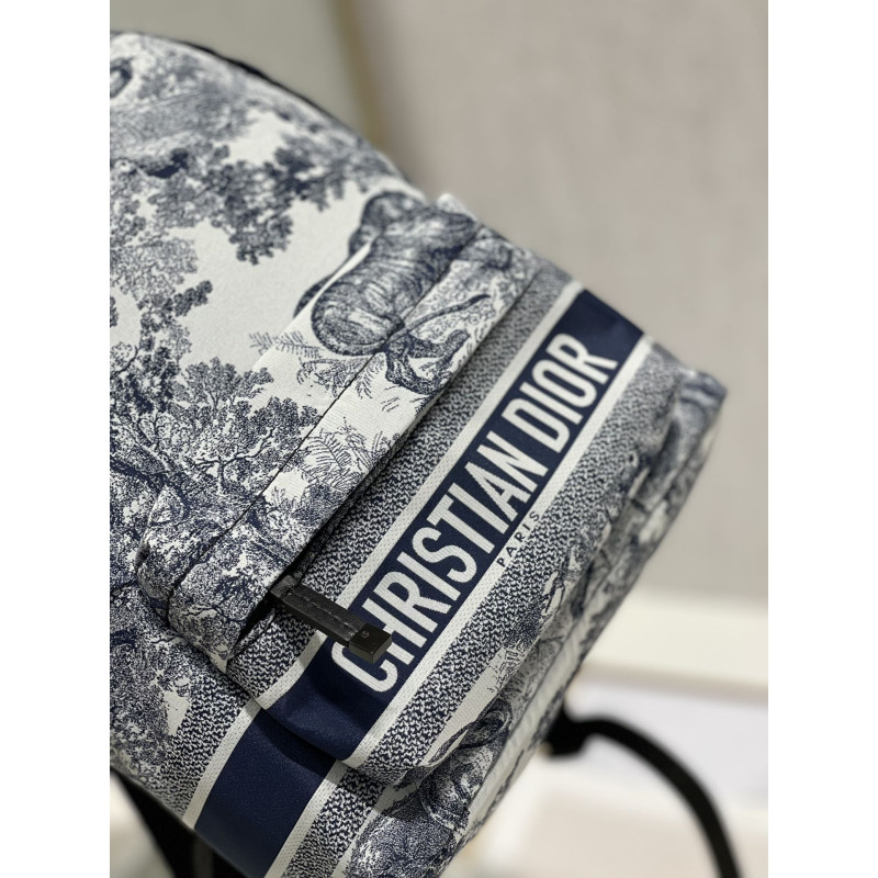 Embellished with a blue Toile de Jouy print for a contrasting effect. The front is decorated with the 'CHRISTIAN DIOR' logo, with a zipper compartment and external pockets, which can easily store various daily necessities. With an adjustable shoulder strap, it can be carried by hand, on one shoulder or on both shoulders.