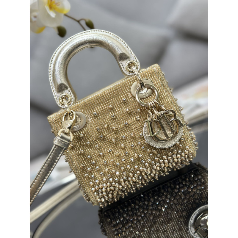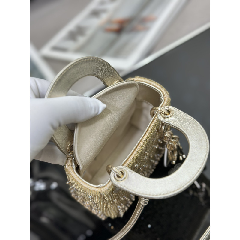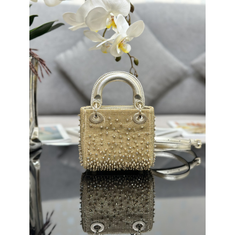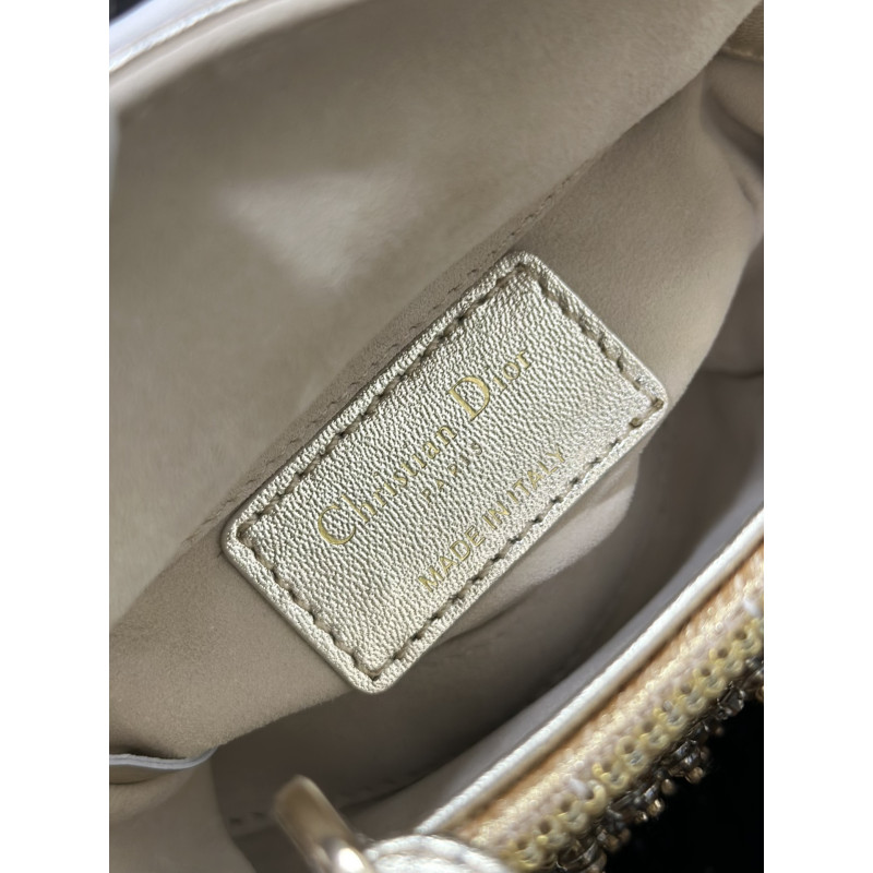 Extra-miniature embroidery beads. Crafted in tonal satin, it's enhanced with ombré-effect beaded embroidery and a D.I.O.R. charm in light gold-finish metal. With a detachable chain shoulder strap and an adjustable, detachable leather shoulder strap, it can be carried by hand, on the shoulder or across the body, making it ideal for everyday or evening looks.