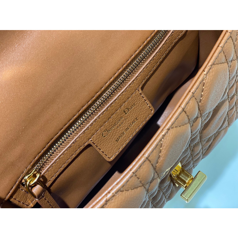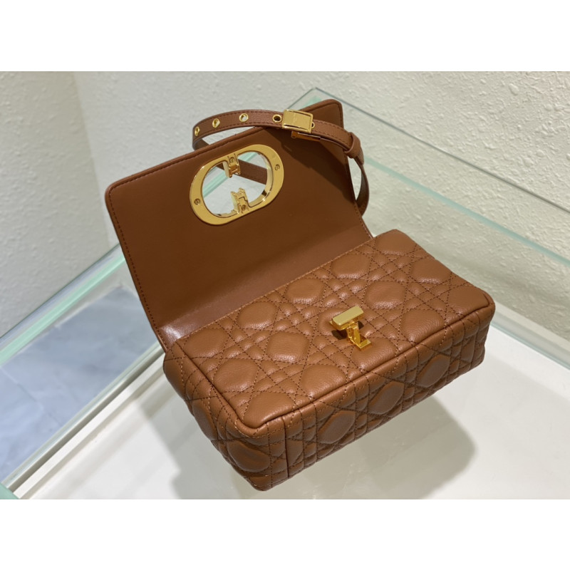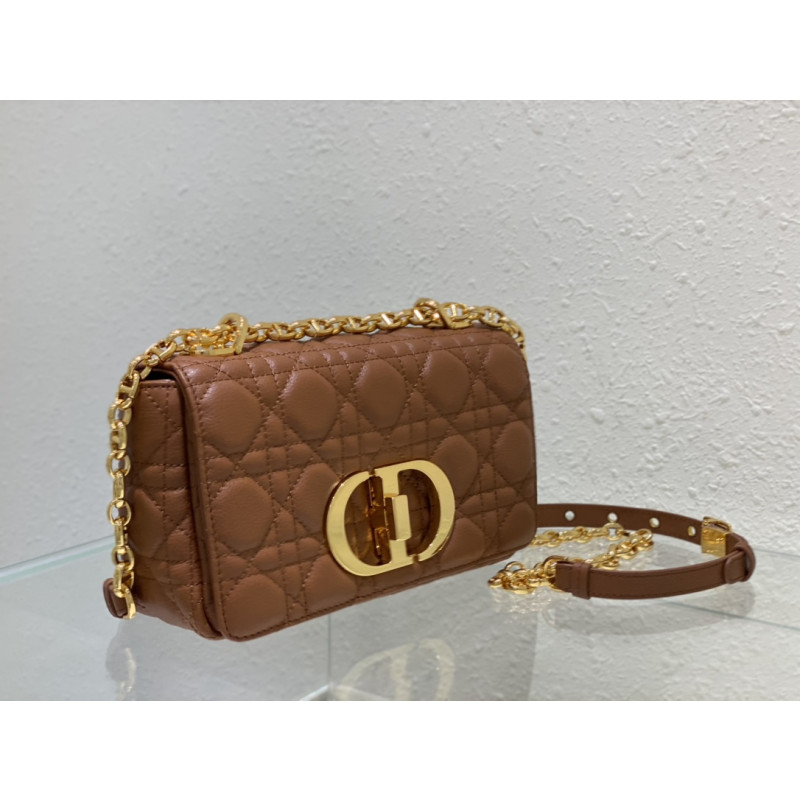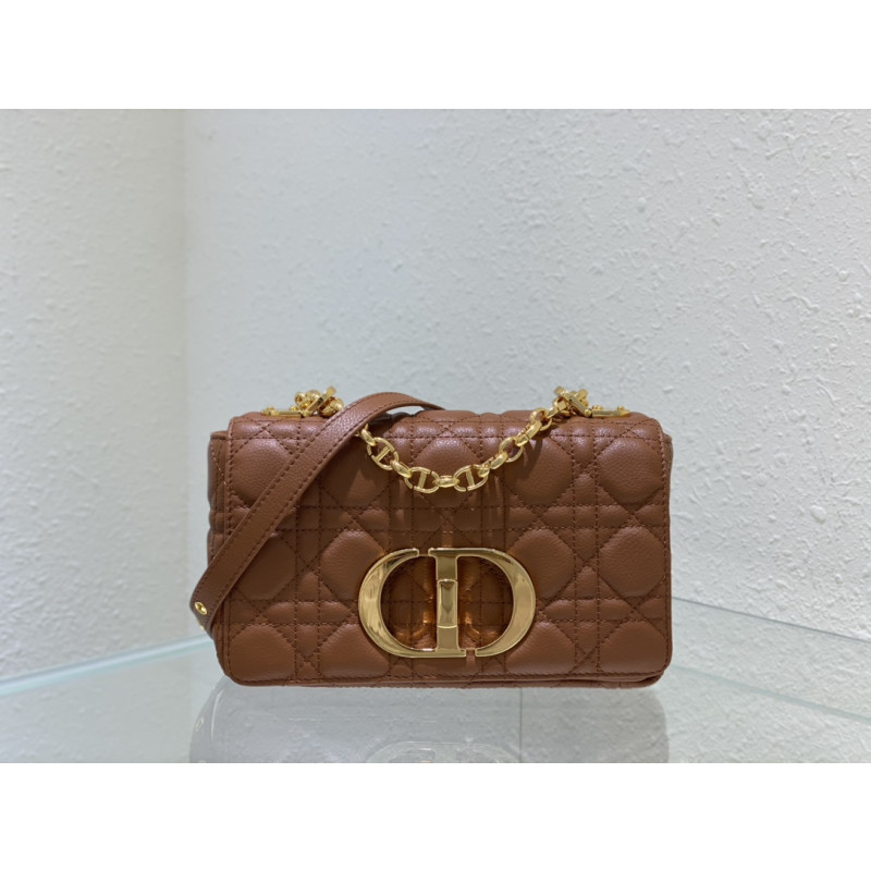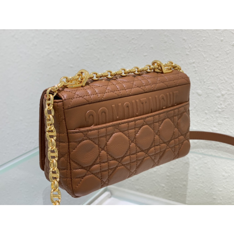 Crafted from calfskin with Cannage stitching. Antique gold-plated metal 'CD' button on the flap, adjustable and detachable chain shoulder strap with 'CD' logo links, can be carried by hand, shoulder or crossbody, and can be matched with different embroidered shoulder straps.