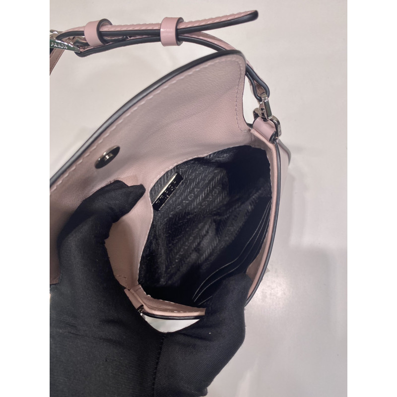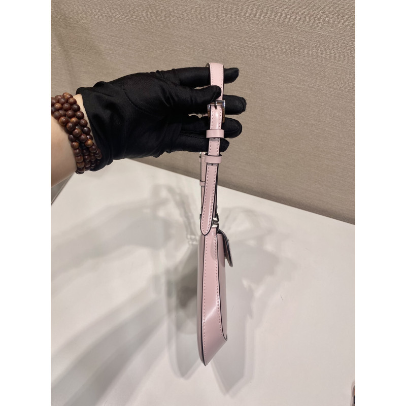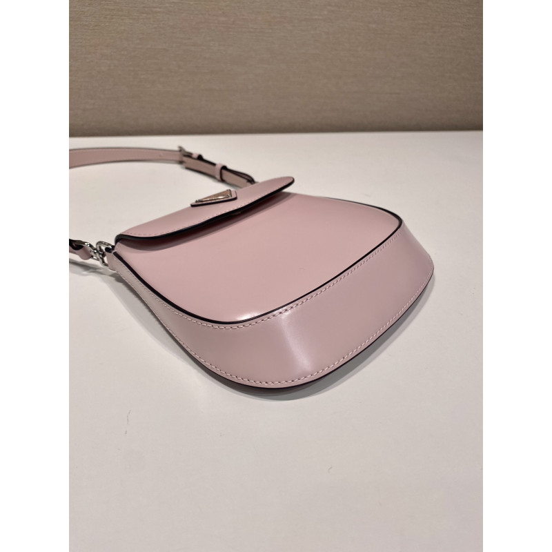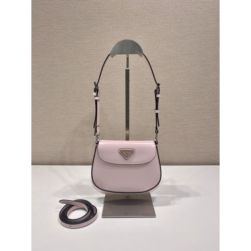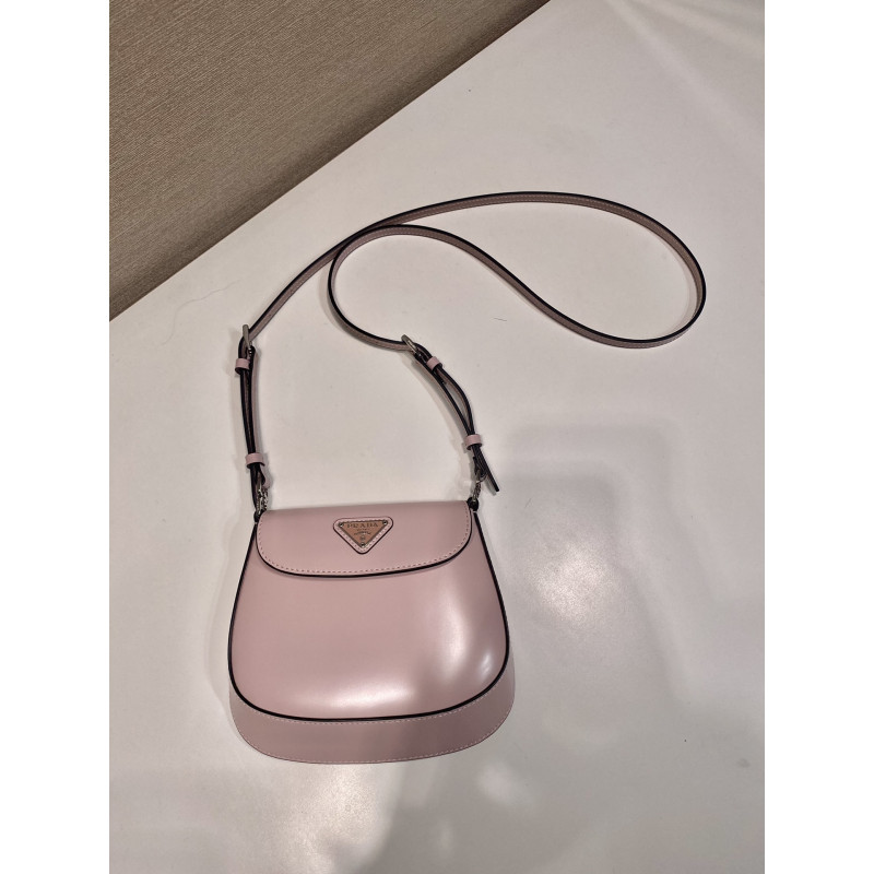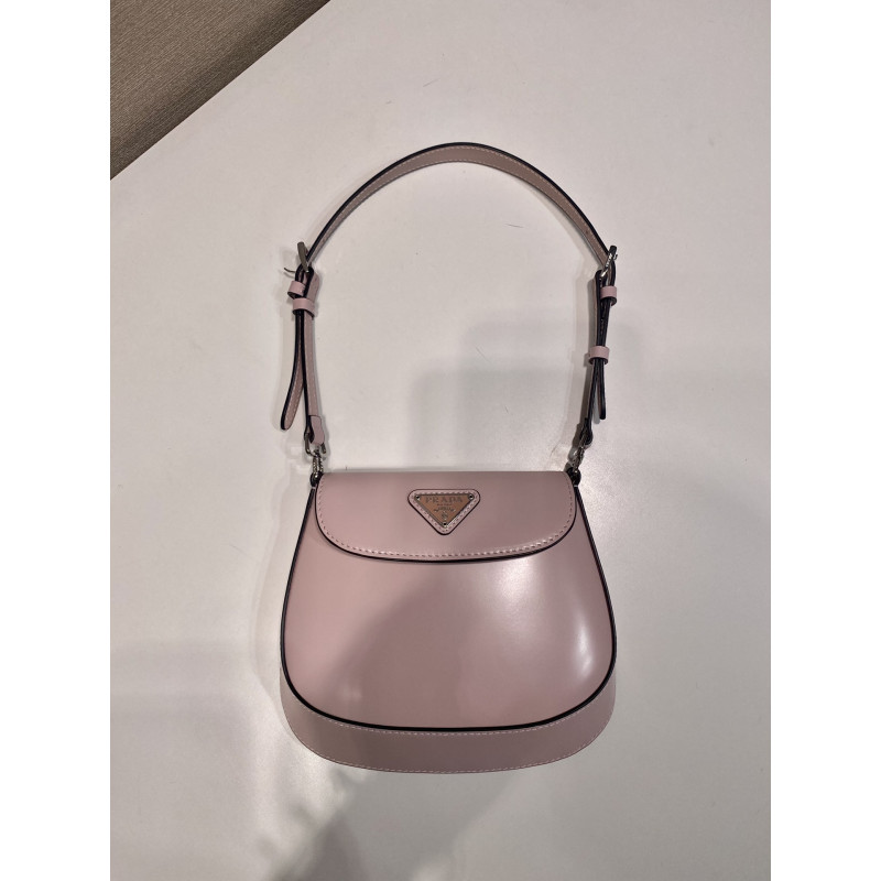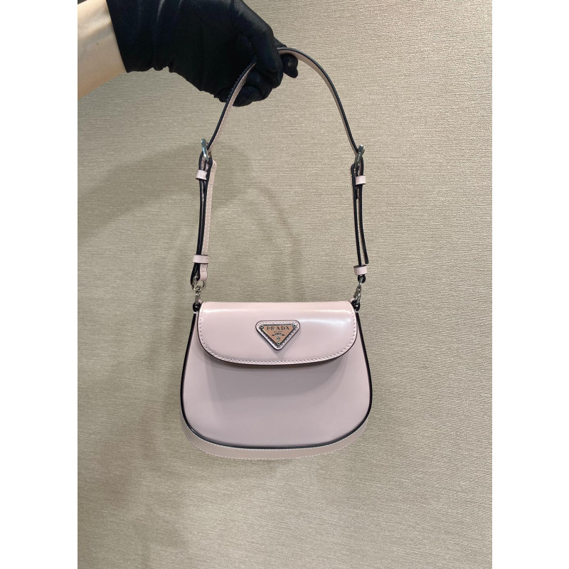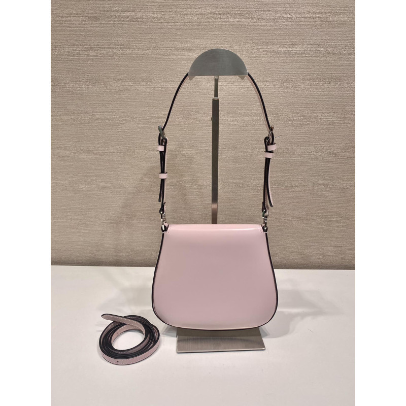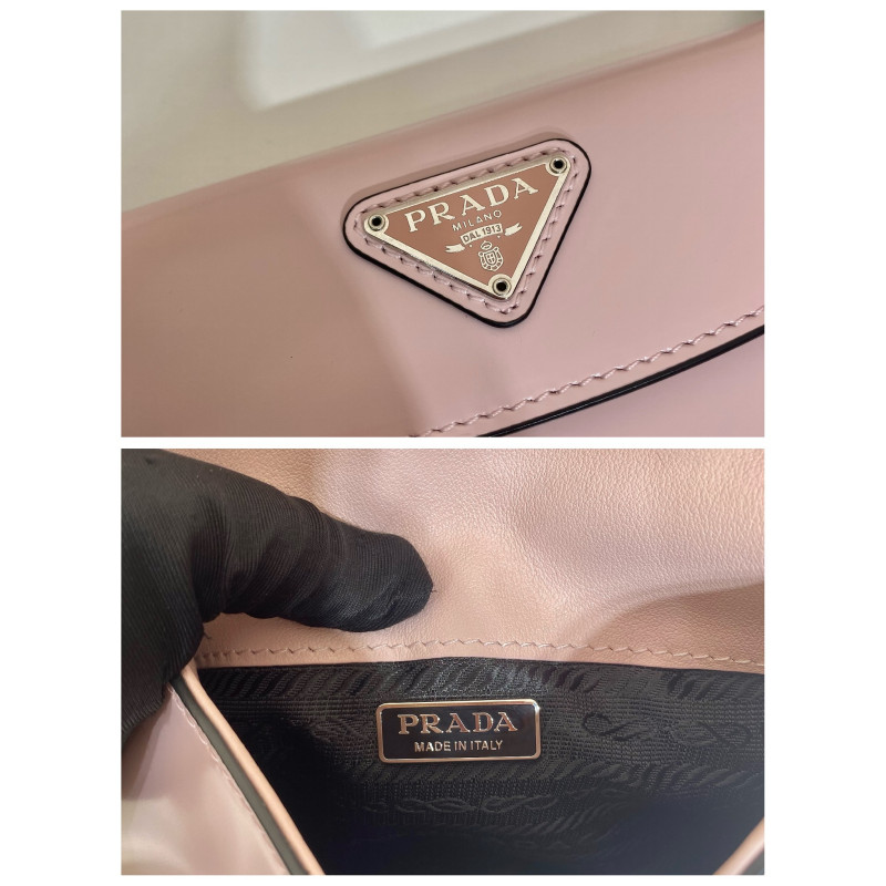 The special beveled structure of the bottom and sides of this flap bag emphasizes the smooth curved lines and gives it a sophisticated appeal, while the extended handles make it even more functional, allowing it to be worn as a shoulder bag or a tote. Brushed leather, unique to the Prada collection, is a modern, color-changing material perfect for new combinations and contrasts. A triangular enameled logo completes the silhouette.