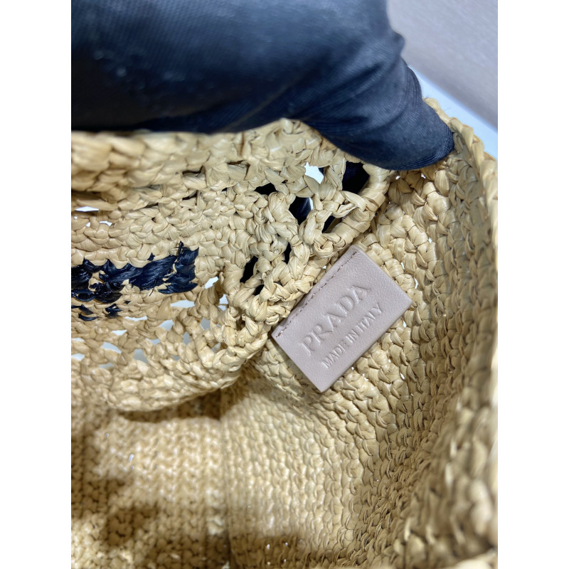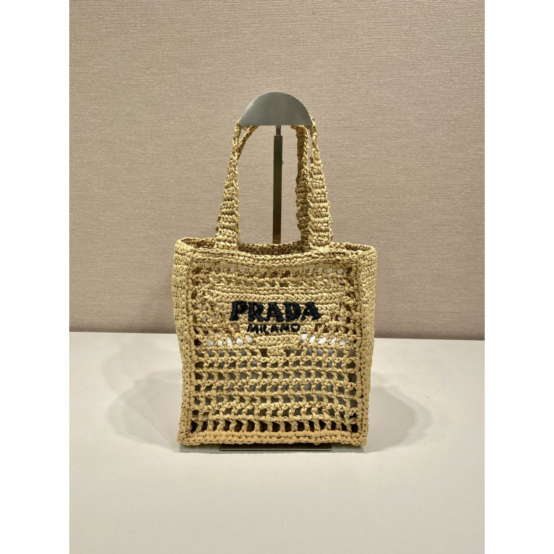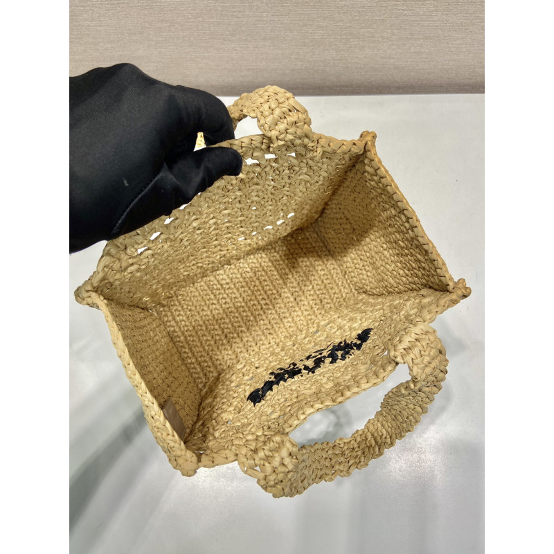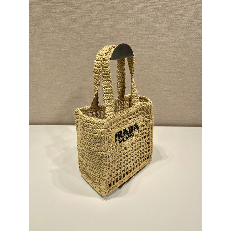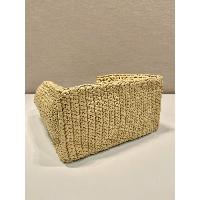 Soft, deconstructed tote bag in raffia-effect yarn, a lightweight and natural material. Embroidered lettering accents the triangular logo on the front, adding a signature touch to the accessory.