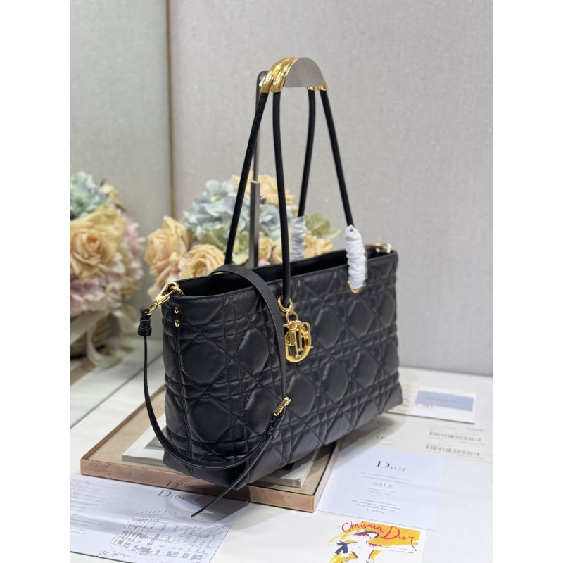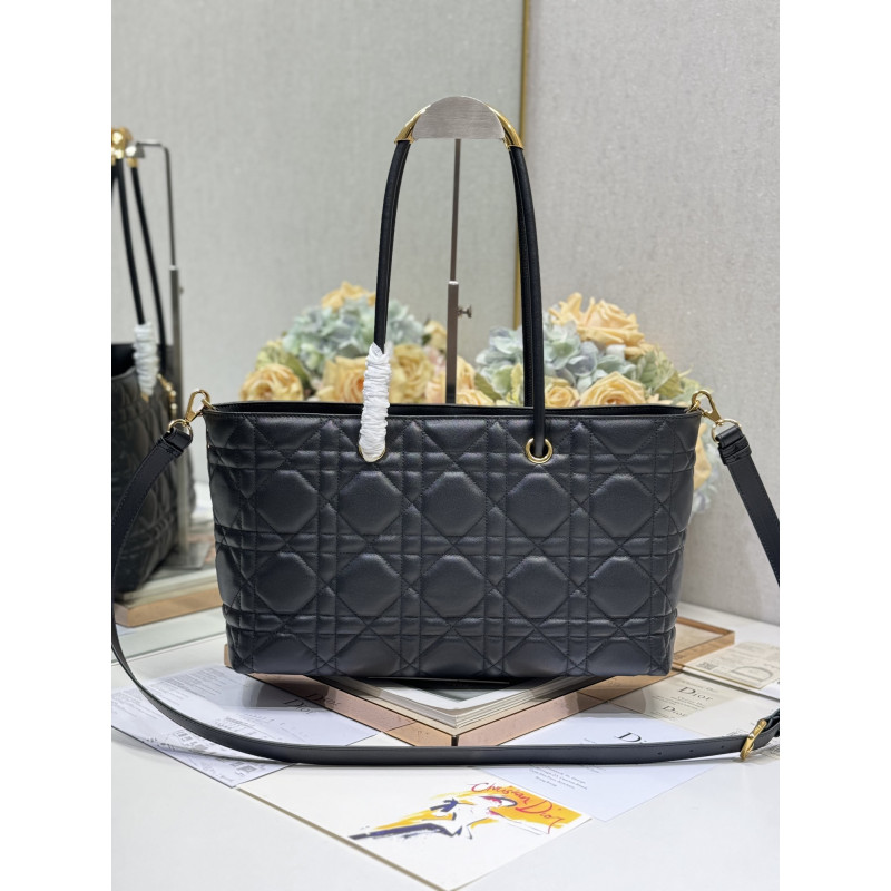 DetailThis Dior Toujours handbag is meticulously crafted from black calfskin, featuring oversized Cannage topstitching. Its spacious interior compartment allows for neat storage of daily essentials. The structured top handles, adorned with vintage-finish metal accents, offer effortless hand-carry options, while the adjustable leather shoulder strap provides versatile styling.