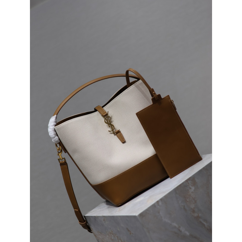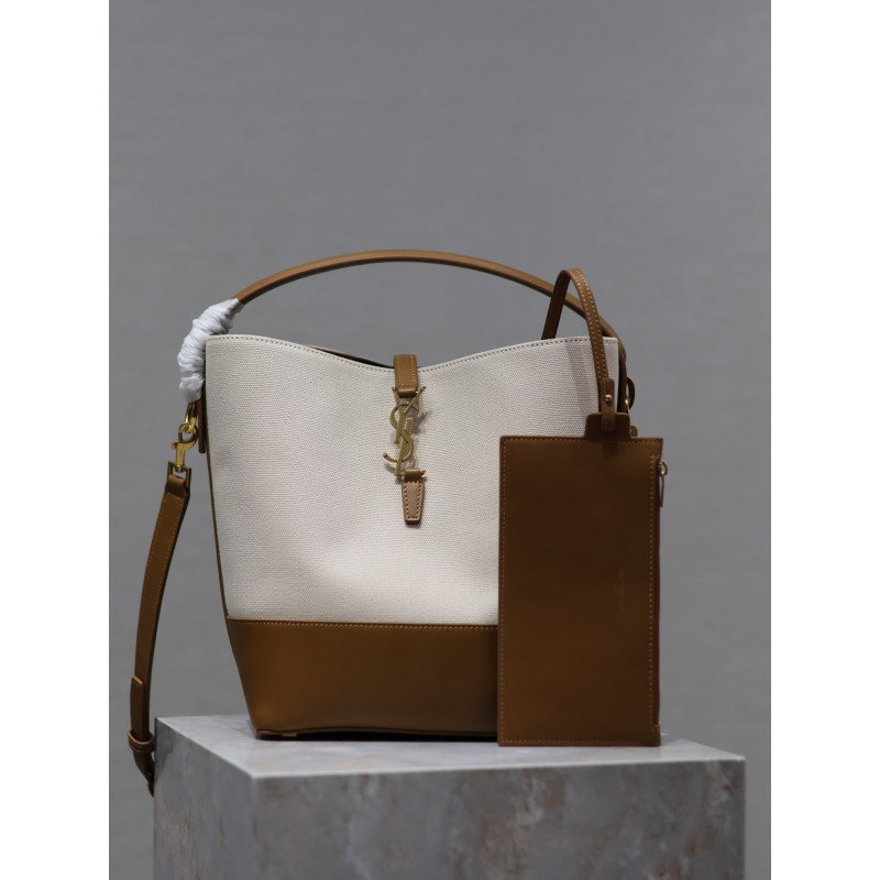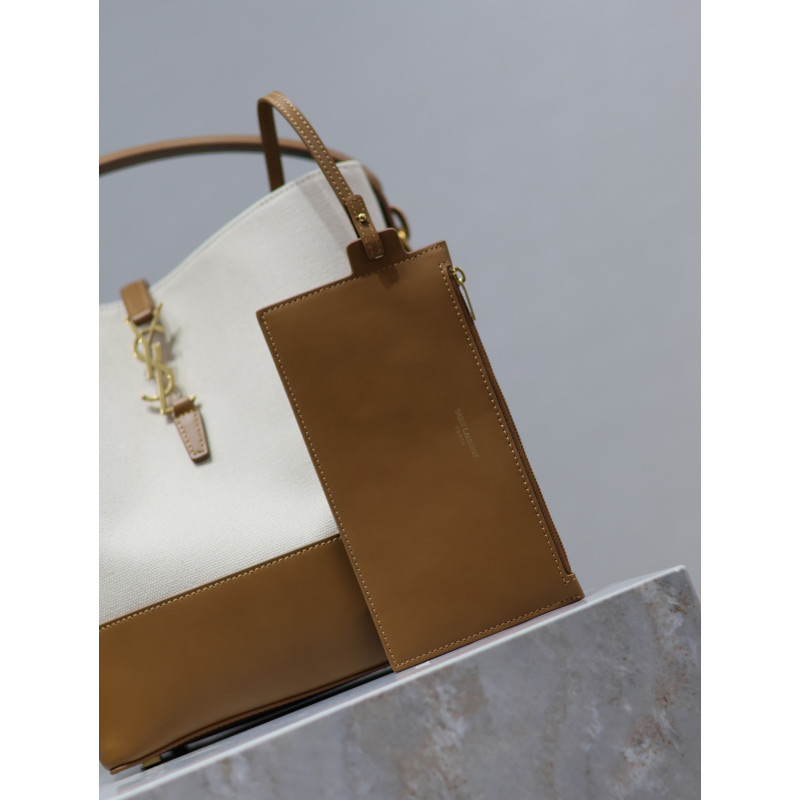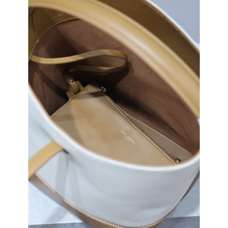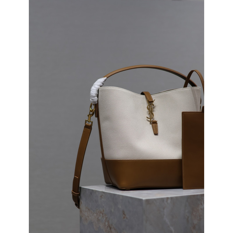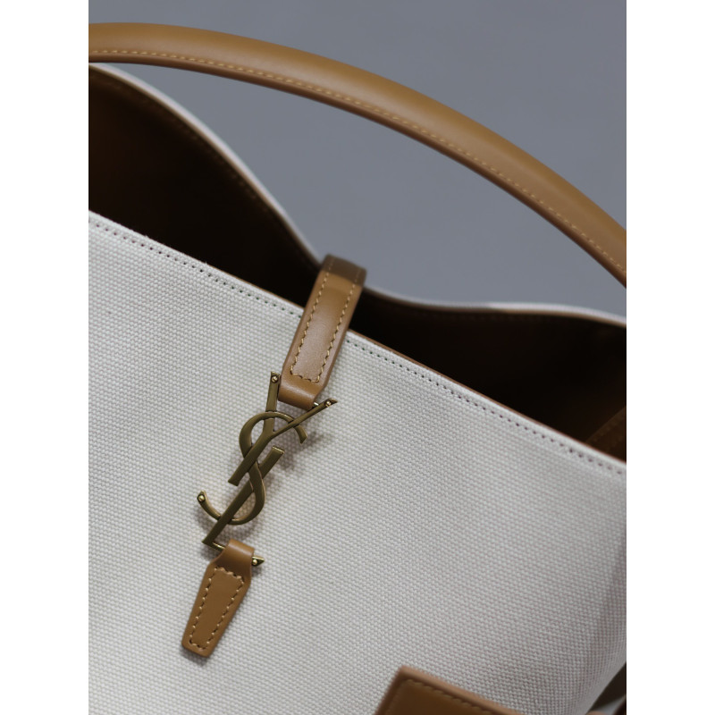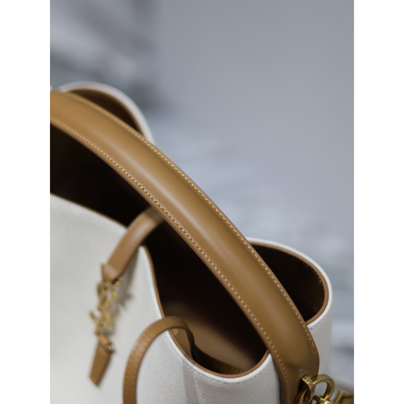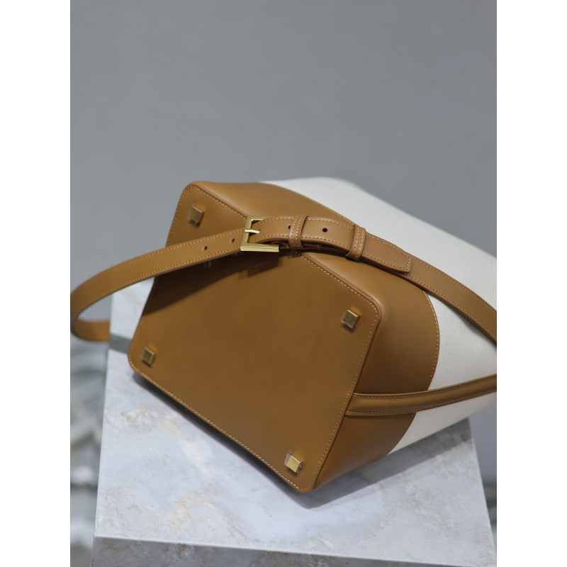Crafted from Italian cowhide paired with cotton-linen fabric, this bag features a clean and structured silhouette. The base is reinforced with metal studs, while the classic signature metal logo clasp adds a refined touch. The overall design strikes the perfect balance between timeless elegance and modern sophistication.
