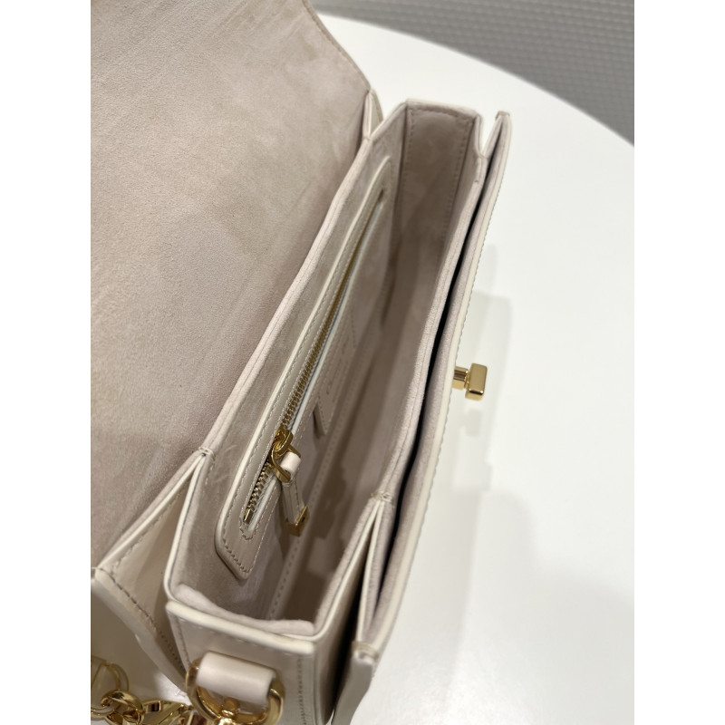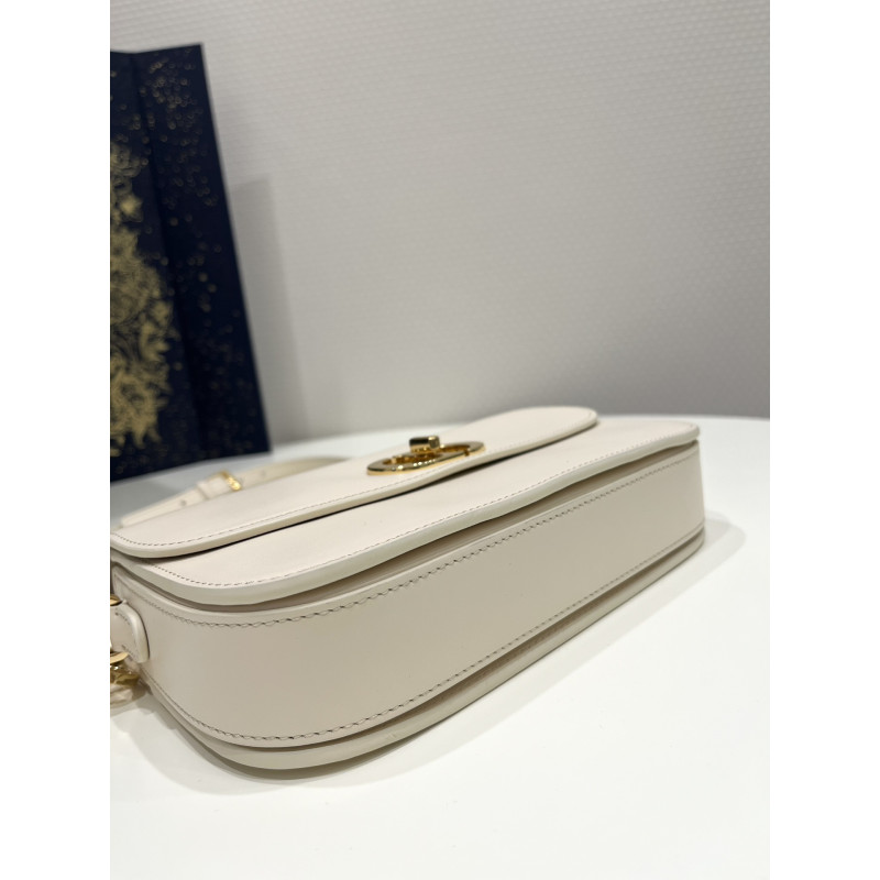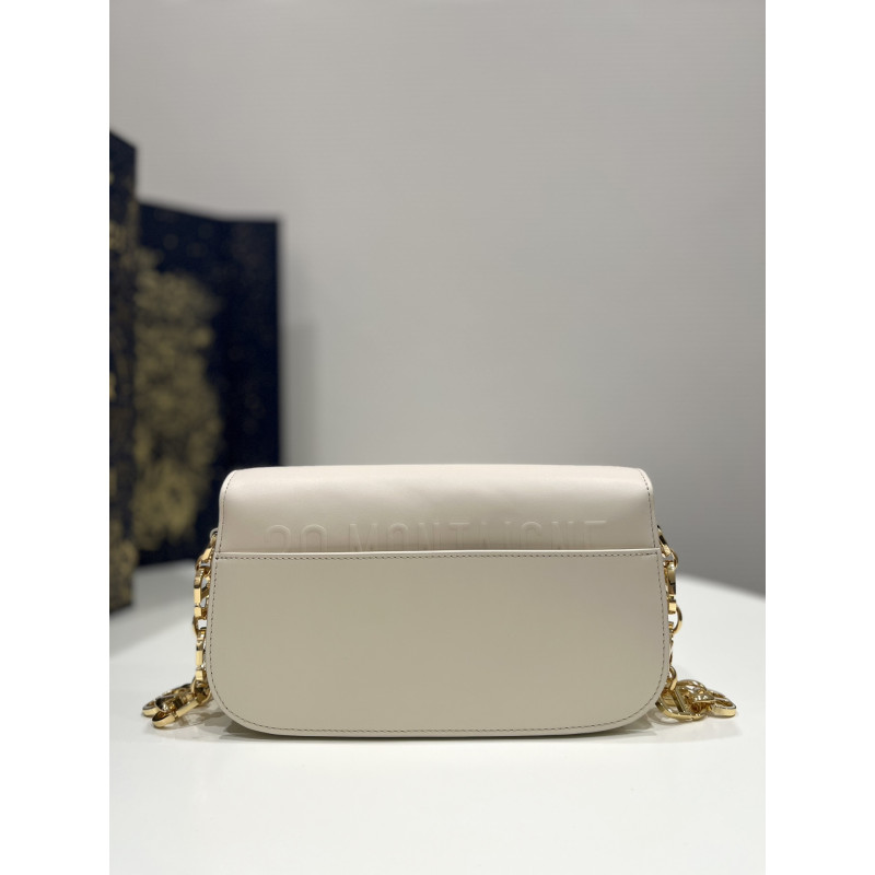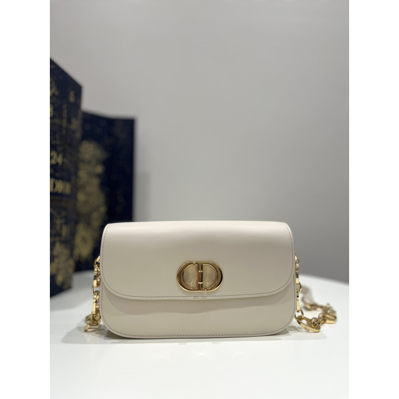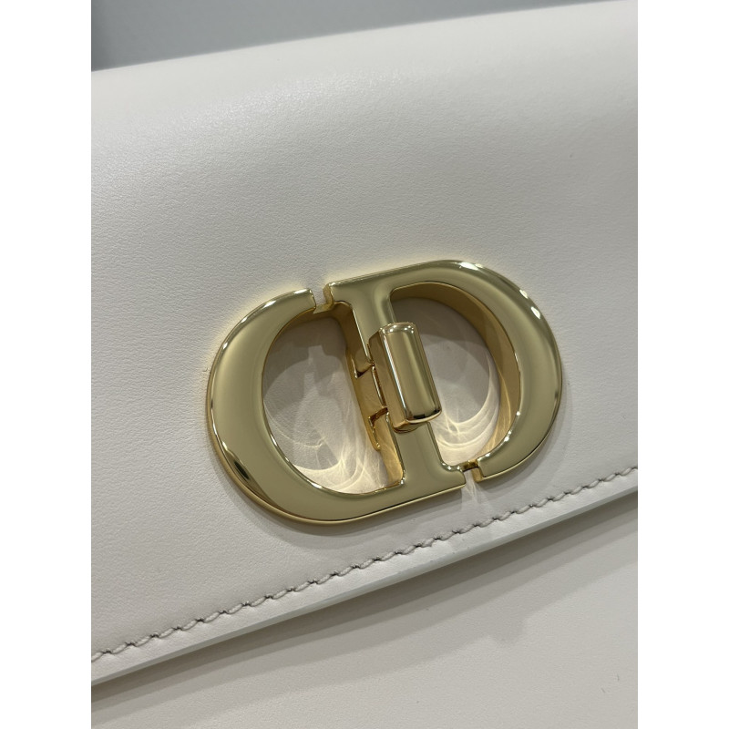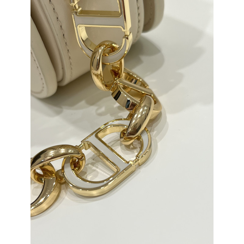 DetailRound flap crafted in calfskin with antiqued gold-plated metal CD clasp, 30 Montaigne logo embossed on the back, and a signature chain with alternating gold-finish metal and tone-on-tone enamel links to match the leather, adjustable. The bag is roomy and refined in shape and can be carried in the hand, over the shoulder or across the body.