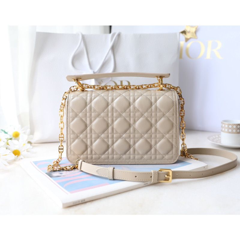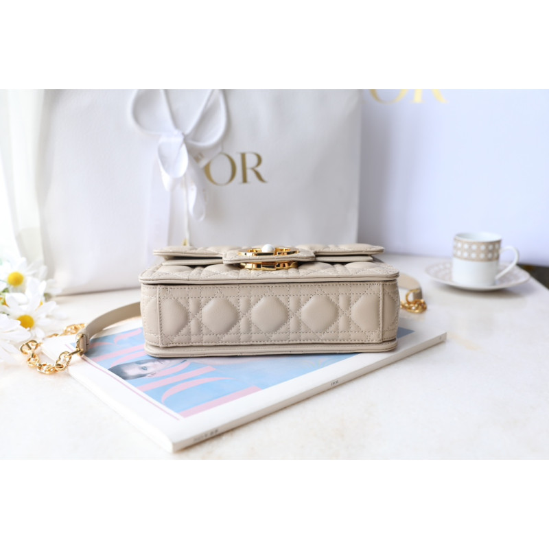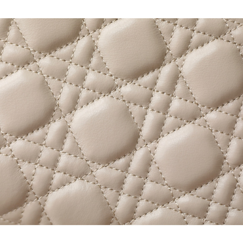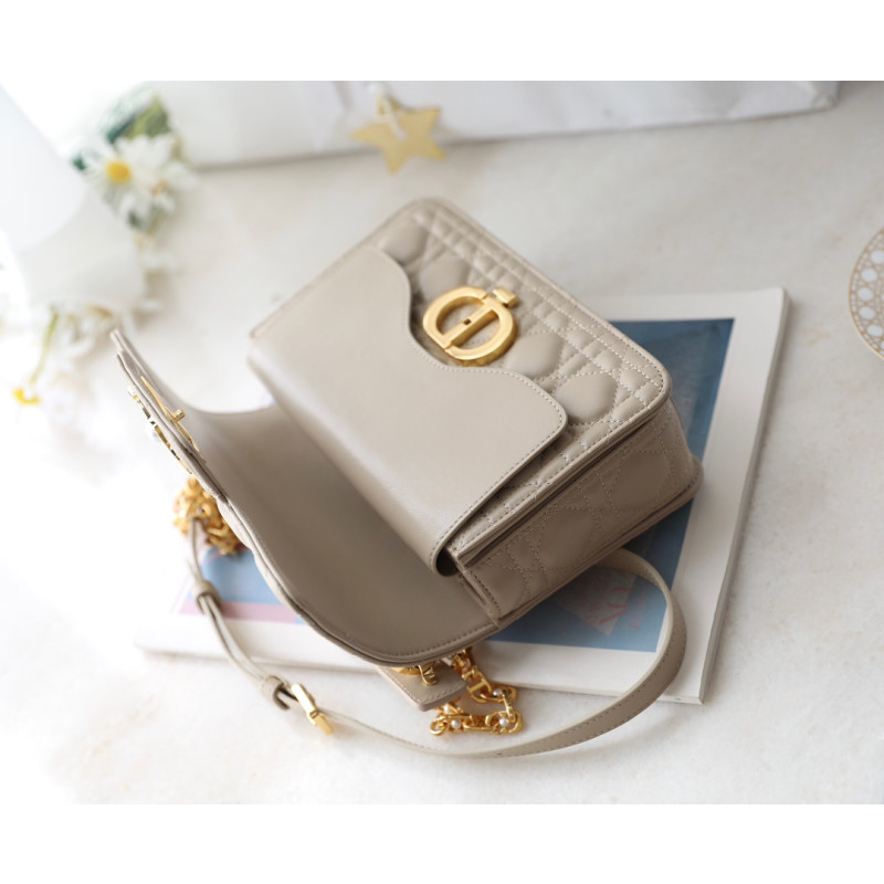 DetailMade from white cowhide leather with lattice-pattern stitching and a double flap adorned with the CD logo, complemented by white resin beads. It features three compartments and a zip pocket for everyday essentials, ideal for both casual and evening outfits.
