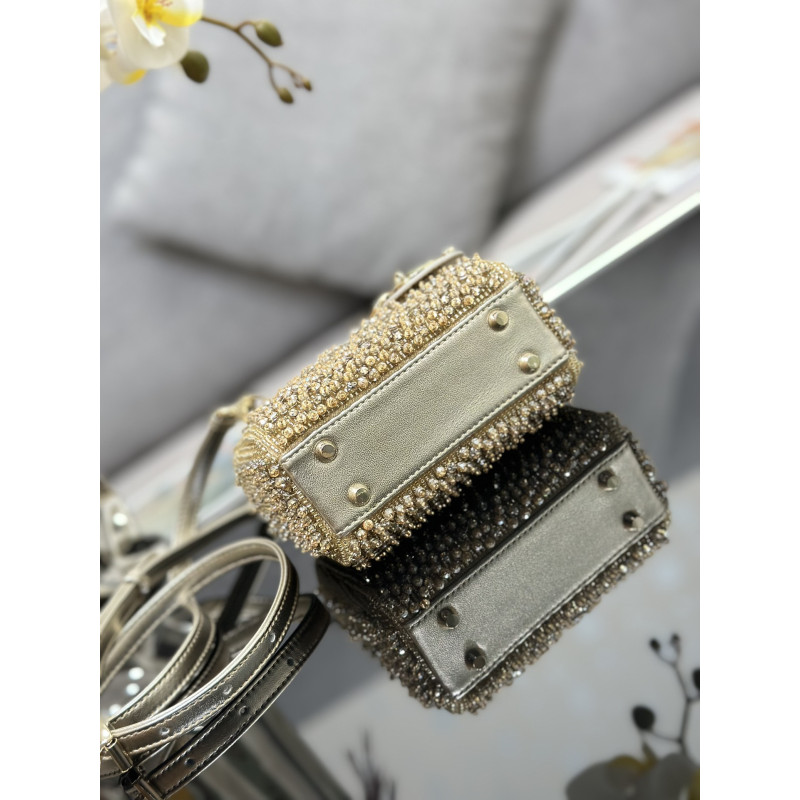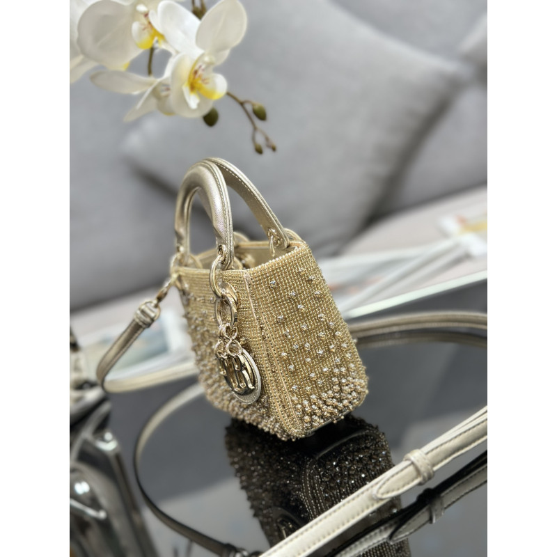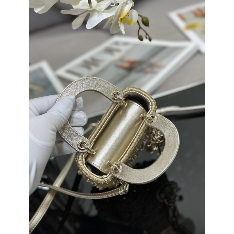 Extra-miniature embroidery beads. Crafted in tonal satin, it's enhanced with ombré-effect beaded embroidery and a D.I.O.R. charm in light gold-finish metal. With a detachable chain shoulder strap and an adjustable, detachable leather shoulder strap, it can be carried by hand, on the shoulder or across the body, making it ideal for everyday or evening looks.