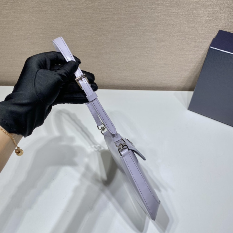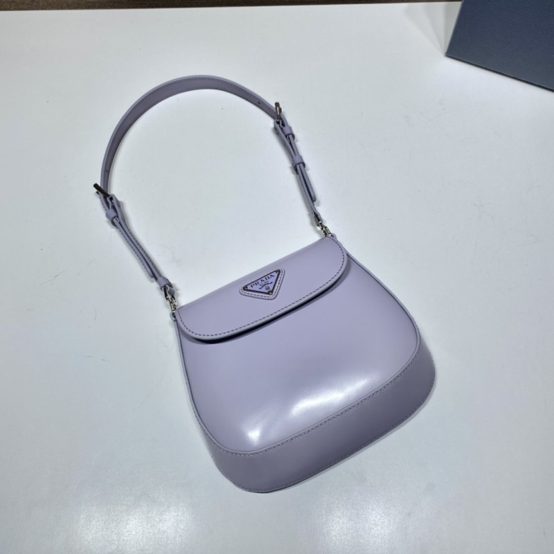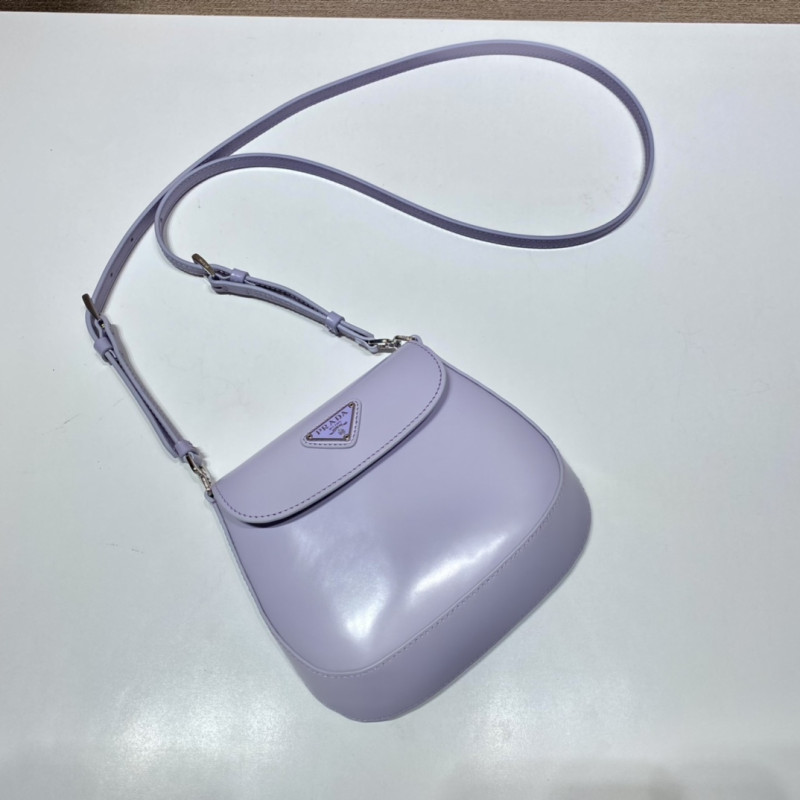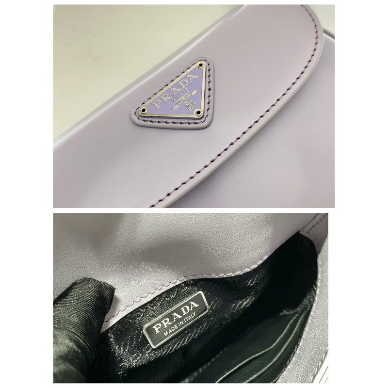 The special beveled structure of the bottom and sides of this flap bag emphasizes the smooth curved lines and gives it a sophisticated appeal, while the extended handles make it even more functional, allowing it to be worn as a shoulder bag or a tote. Brushed leather, unique to the Prada collection, is a modern, color-changing material perfect for new combinations and contrasts. A triangular enameled logo completes the silhouette.